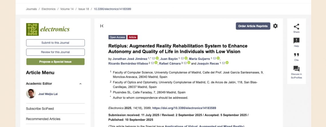En Retiplus estamos orgullosos de anunciar que nuestro sistema de rehabilitación visual vuelve a aparecer en la investigación científica. Un nuevo artículo universitario sobre RETIPLUS salió publicado en la prestigiosa revista internacional Electronics (MDPI).